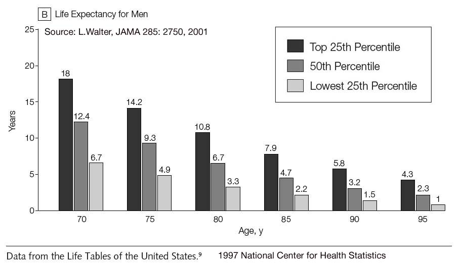 For a 75 year old man, median life expectancy is shown as 9.3 years. Since the data are now more than 11 years out of date, we are rounding this off to 10 years as a current approximation.