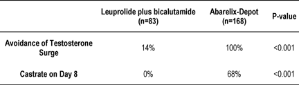 Source: Asco Online, #1307 - Publication Year: 2000 Abarelix-Depot (A-D) Versus Leuprolide Acetate (L) Plus Bicalutamide [Casodex (C)], for Prostate Cancer: Results of a Multi-Institutional, Randomized, Phase III Study in 255 PatientsJohn Trachtenberg, Marc Gittelman, Chris Steidle, Winston Barzell, William Friedel, Dennis Pessis, Nick Fotheringham, Marilyn Campion, Marc B. Garnick, for the Abarelix-Depot Study Group, Univ of Toronto, Toronto, Canada; South Florida Medical Research, Aventura, FL; North Indiana Urology, Fort Wayne, IN; Urology Treatment Ctr, Sarasota, FL; San Diego Urology Ctr, La Mesa, CA; Affiliated Urologists, Chicago, IL; Amgen, Inc, Thousand Oaks, CA; Praecis Pharmaceuticals, Inc, Cambridge, MA.Introduction and Objectives: Abarelix-Depot (A-D), a GnRH antagonist, has shown promising endocrinologic and clinical results in phase I/II trials in prostate cancer patients (pts), including absence of testosterone (T) surge and clinical flare. We therefore compared A-D 100 mg and leuprolide acetate (L) 7.5 mg plus bicalutamide (C), 50 mg (L plus C) in a multicenter phase III study in 255 prostate cancer pts who were candidates for initial hormonal therapy. Methods: Using 2:1 allocation, 170 pts were randomized to A-D and 85 pts to L plus C. A-D or L was given by IM injection on days (D) 1, 29, and 57; A-D pts received an additional injection on D15. C was given orally at 50 mg/day throughout the study. Serum levels of T, dihydrotestosterone, and gonadotropins were assessed throughout. Efficacy measures included avoidance of T surge (T notł10% of baseline); rapidity of achieving medical castration in the first week of treatment (TŁ50 ng/dL on D8); and achievement and maintenance of castration from D 29 through 85 (T > 50 ng/dL on two consecutive readings at least 2 weeks apart counted as failures). Safety events and detailed laboratory values were monitored throughout. Results: 168 A-D patients and 83 L plus C were evaluable. Median age was 73 years and 80% of pts were Caucasian. A-D was significantly more effective in avoidance of T surge (p<0.001) and rapidity of achieving medical castration (p ><0.001). A-D and L plus C achieved and maintained medical castration in > 90% of patients. Both leuprolide plus bicalutamide and Abarelix-Depot were well tolerated. {see table} Conclusions: In this phase III study, Abarelix-Depot, a GnRH antagonist, achieved medical castration more rapidly than leuprolide plus bicalutamide, without any evidence of the initial testosterone surge characteristic of GnRH superagonists. Greater than 90% of patients on this study achieved and maintained medical castration through 12 weeks. |