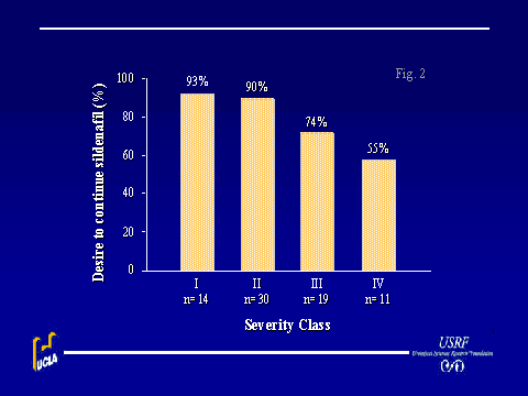 Figure 2. Relationship between the patient's desire to continue sildenafil (vertical axis) and baseline Severity Class (horizontal axis). The more severe the dysfunction, the less likely the patient's desire to continue sildenafil.
