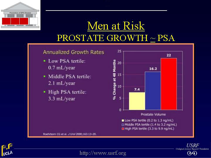 | The explanation for the risk probably has to do with accelerated prostate growth in men with high PSA levels. In these data, men with high PSA levels at baseline show a much more rapid growth of the prostate in ensuing years (in % terms) than men with low PSA levels. |