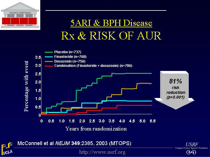 | 5ARI drugs reduce the risk of acute urinary retention (AUR). The MTOPS study (Medical Therapy of Prostatic Symptoms) showed that compared to alpha-blockers, a 5ARI drug finasteride reduced the risk of AUR. Symptomatic relief was greatest with both drugs used together, but protection from BPH disease was primarily related to the 5ARI component. |