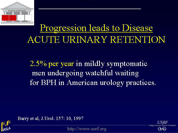 Acute urinary retention (AUR) is the best studied form of BPH disease; it is also the most dramatic and the most well-defined. AUR may occur in approximately 2.5% of men annually in observation programs.