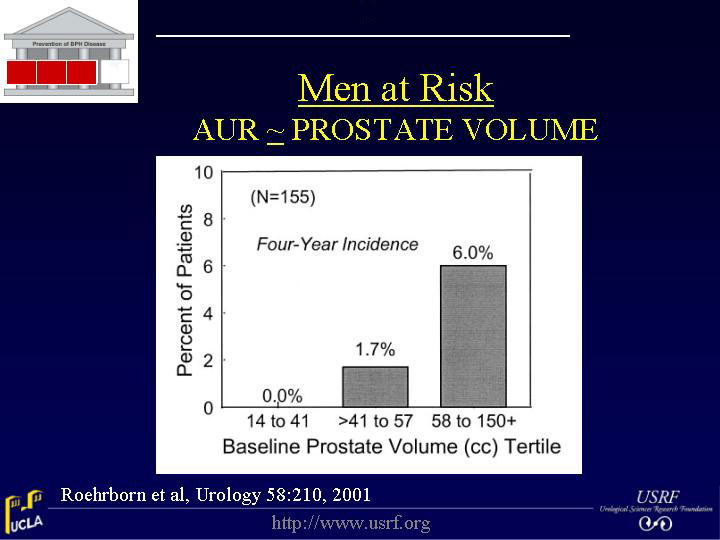 | The 3rd pillar of the prevention logic is that men at risk can be identified. They are the men with Enlarged Prostate, ie, a gland volume exceeding 40 cc. In this landmark publication, men with prostates less than 40 cc in size were not at risk of AUR, whereas that risk increased substantially as prostate volume increased. |