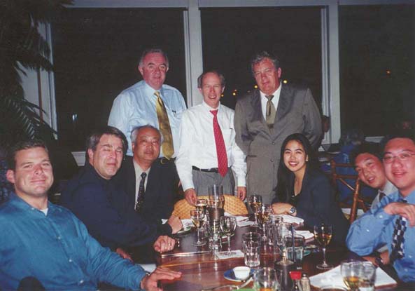 After a long, rigorous week at the 2001 Annual AUA Meeting, the USRF staff and colleagues wind down at the famous Duke's Huntington in Huntington Beach, CA (left to right): Sean Moloney (CEO of Healthcommunities.com), Howard Soule, Ph.D. (Chief Science Officer of CaPCURE Foundation), Munekado Kojima, M.D. (Nagoya Urol. Hospital), George Holder (Bayer Corp.), Leonard S. Marks, M.D. (UCLA), Frederick J. Dorey, Ph.D. (UCLA), Arlyn S. Llanes, CCRP (USRF), Charles Yau (USRF), and John Fan (USRF). |
