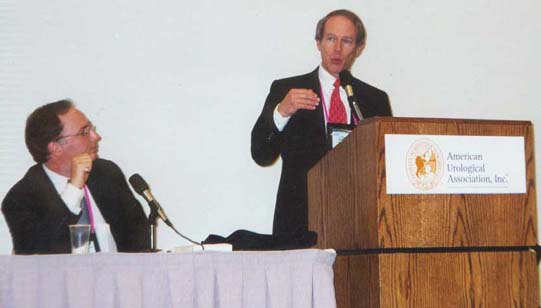 USRF Founder, Dr. Leonard S. Marks, is presenting the poster in front of an audience of well-respected reseachers during a poster session at the 2001 Annual AUA Meeting. To the left is the session chairman, Dr. Kevin Slawin (Baylor U.) |
