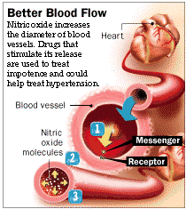 "The Nitric Oxide Story" Adapted from original story in New York Times (March 28, 1998) Photo courtesy of the L.A. Times As long as the man remains sexually stimulated, he continues to produce cGMP. But at the same time, he makes another chemical, phosphodiesterase Type 5 (PDE-5), which destroys cGMP. The result is an equilibrium: the production and degradation of cGMP are in balance, and the penis remains erect. When cGMP stops being produced, PDE-5 takes over, destroying the leftover chemical. The erection disapears. Viagra blocks PDE-5. If a man who is impotent takes the drug, it boosts the effects of cGMP in his penis by slowing its degradation. The result can be an erection in a man who would not normallly be able to have one. PDE-5 is not found in important quantities elsewhere in the body--the coronary arteries, for example. That is why Viagra did not alleviate angina. |